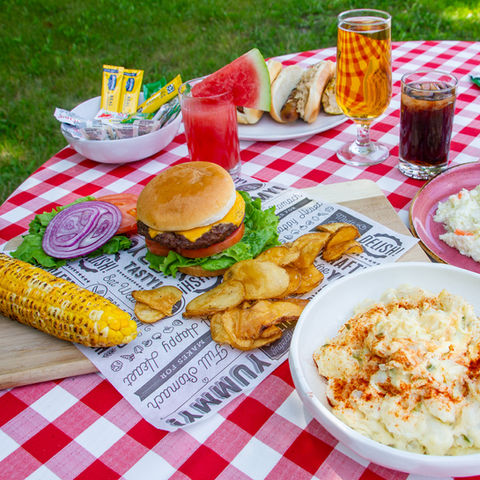 Enjoy classic sides such as Sweet and Tangy Baked Beans, Fresh Corn on the Cob with melted butter, and our signature Red Skin Potato Salad. Finish with Creamy Cole Slaw and a delectable Rice Crispy Treats & Fudge Nut Brownie Assortment.